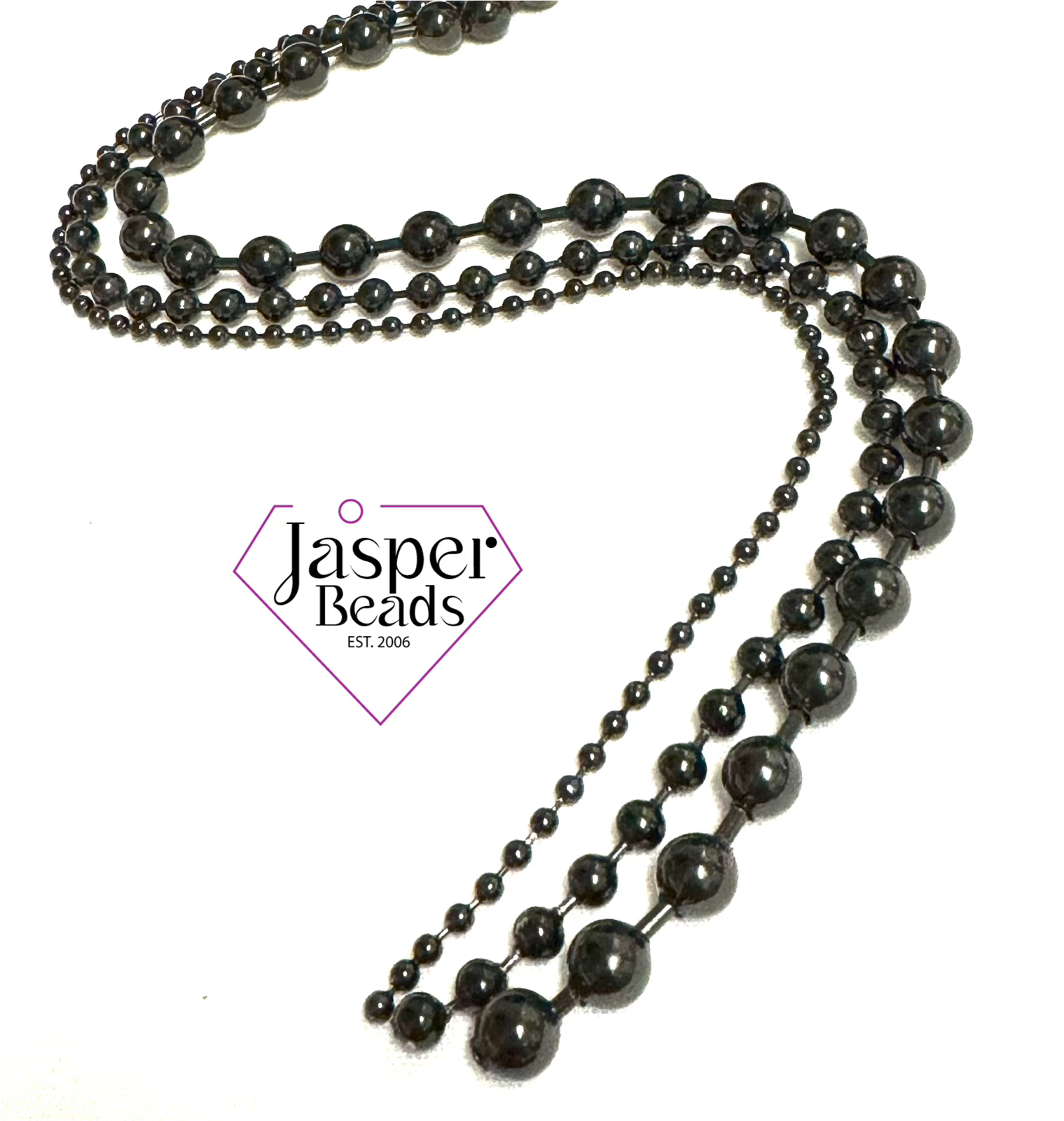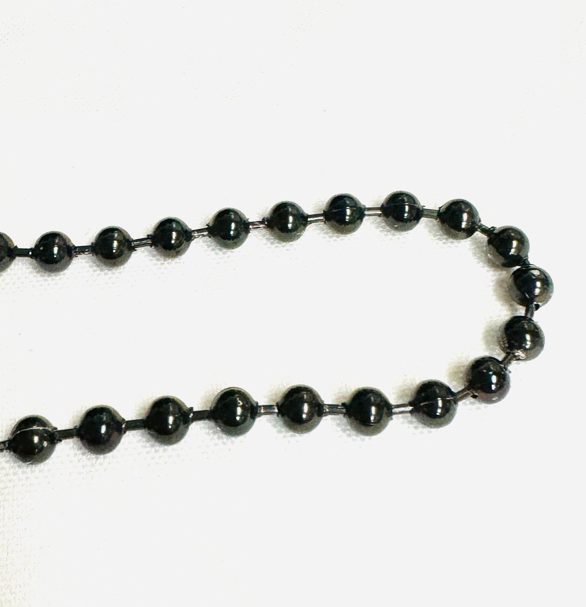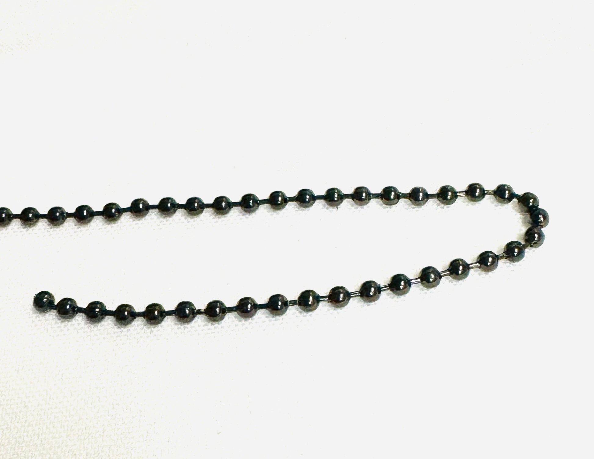 Made of stainless steel, this ball chain comes in black color. Available to purchase by the foot, it is available in a range of sizes.